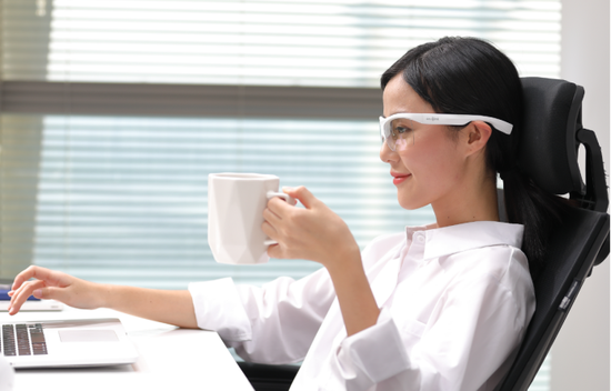 在鼻梁的位置,独特设计预留了一个磁吸接口,让用户可以轻松的更换和定制不同款式和材质的镜片。在产品包装内也会在标配的护眼蓝光镜片的同时,附送一副适合户外运动和驾驶的防雾偏光镜片。为用户提供了护眼的同时,在游戏和办公中用户不自觉本能的头部运动,也能很好的让一直静止的颈椎得到活动和放松。眼镜配色方面,除了常见的黑白基本款,还推出金属红和蓝两个限量版本。
