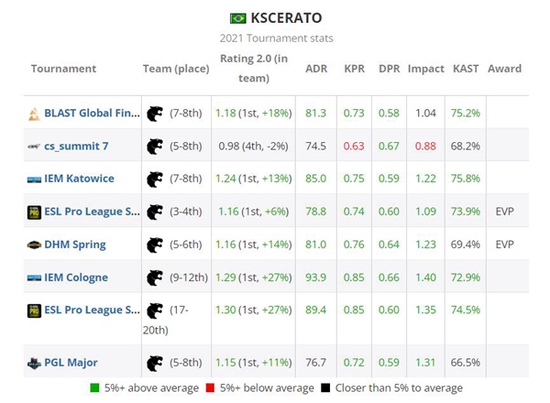 KSCERATO从队伍中脱颖而出的另一个关键因素在于他那极高的上限,他在多数对局中均表现出强劲的实力,这也为他带来了两次EVP提名与五次VP提名,但没有MVP提名也直观的表现出他缺少足够的队伍荣誉作支撑。KSCERATO最终在本年度榜单上排名第15位, 过少的比赛地图总数(86张图),并且全年仅参加8场大型赛事,再加上他的峰值较低,这些因素是他无法获得更高名次的根本原因。
