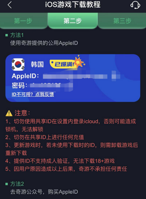 由于韩服Apple ID注册起来有条件限制,所以建议大家直接用奇游内的公用ID。