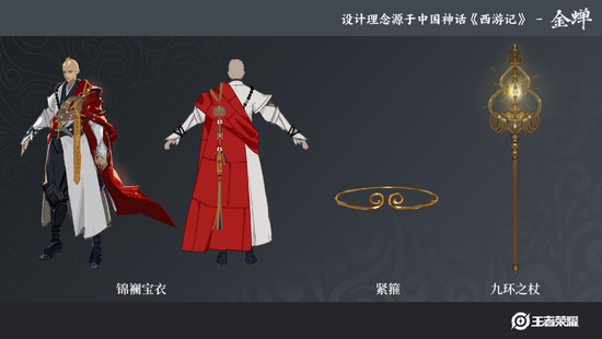 作为传统神话故事中的核心人物,王者前段时间新出的法辅英雄金蝉有着复杂的故事和人物解读,因此寻找金蝉的设计核心也注定并不容易。在不断提出和淘汰设计方案以后,王者荣耀设计团队最终选择了“三神器”作为金蝉的核心概念,也就是紧箍咒、锦襴宝衣和九环之杖,刚好对应了英雄的三个技能。