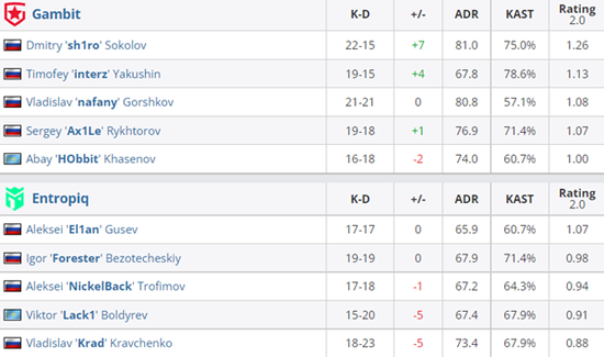 下半场手枪局Entropiq和红星一样5人A大枪法取胜。次局Entropiq再次进攻A大,sh1ro鸟狙双杀奠定胜局,红星翻盘成功。Entropiq也选择强起第二时间rushB被B区双人组拦截,比分10-9。第二十局Entropiq在A大一换二,枪法失误比分被扳平。次局Entropiq本想提B被sh1ro大狙劝退,转A小再次被HObbit劝退,两人选择保枪。第二十二局Entropiq抢下A大,其余人速提A小抢下包点,但局势再次被红星极强纪律性扭转,比分10-12。Entropiq战术十分简单,打A就打A不骚扰B使得红星轻而易举防守包点。第二十五局Entropiq默认后夹A,El1an精准大狙赢下1v2残局,次局Entropiq一波提B,包点CT二换三顶住压力,红星拿到赛点。第二十七局双方A大二换二,中路NickelBack杀出血路扳回一个赛点。第二十八局Entropiq第二时间提B,B点双人组连杀四人,恭喜红星夺冠。