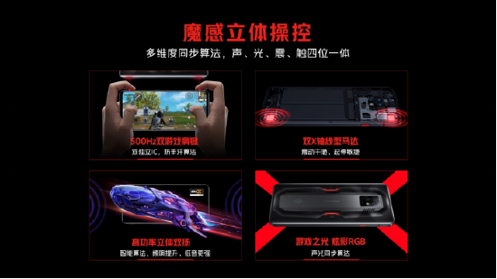 红魔作为首个启用肩键的手机品牌,强调了作为专业游戏装备品牌的使命,此次更是将双独立IC肩键触控采样率提升至500Hz,肩键触控响应更加精准,配合双X轴线性马达,可实现触控与震感沉浸一体的游戏体验,助力玩家把握游戏战场的制胜瞬间。同时红魔7首次搭载了能高效处理游戏操控运算任务,自适应学习玩家游戏习惯的自研芯片——红芯一号,带来了肩键加强、震感加强、游戏灯效定义、音效增强等四大提升,加上红魔独有的RGB灯效与DTS Ultra X环绕立体音效,实现声、光、震、触四位一体的全沉浸互动游戏体验。