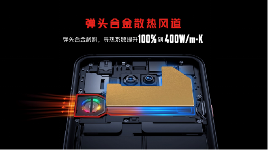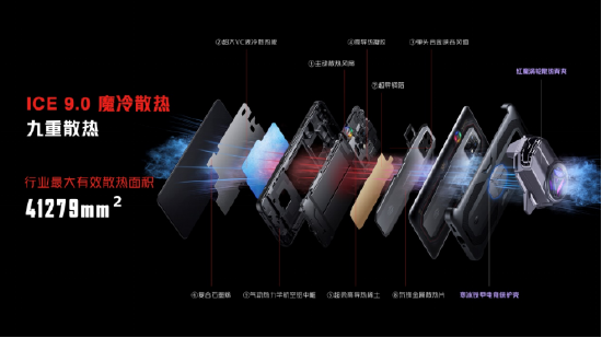为了更好发挥出全新一代骁龙8移动平台的极限性能优势,红魔7系列在散热方案上也做到了极致。全新升级的ICE魔冷散热系统,由高速离心风扇、4124mm2超大VC散热板、航天级散热材料、超柔高导热稀土等组成9层散热结构,打造全行业首款散热材料面积高达41279mm2的游戏手机。其中,超柔高导热稀土配合转速高达20000转/每分钟的主动散热风扇将热量带走,核心热源温度同比上一代,直降3℃!航天级相变材料石墨烯+正二十一烷更是将导热系数提升400倍,配合金属材质的峡谷风道及新增背部45°角开孔形成双进风口,换气效率大幅提升,最高温度下降2.4℃!成就了目前业界最精密、最强大散热方案。