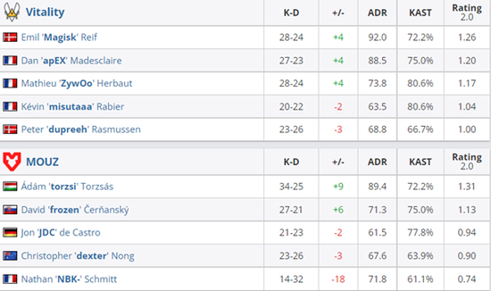 第二十六局MOUZ一波提B,ZywOo包点拖到时间,apEX跳出警家烟救援扳回劣势。第二十八局dupreeh离谱操作多次拔管被架死,A区防线崩塌。次局双方道具抢香蕉道,MOUZ略胜一筹,第二时间爆弹B区拿到赛点。次局dupreeh同样位置不同结果接住两人证明自己,比赛进入加时。小蜜蜂中路前压二换一,Magisk大坑1v3!次局torzsi断死后路后突烟解决B区。第三局香蕉道交战小蜜蜂二换三,Magisk侧身失误痛失好局。易边后Magisk香蕉道双杀,ZywOo离谱石板穿杀,比分17-17。火中英雄torzsi双杀拿到关键人头,MOUZ拿到赛点。次局MOUZ三人抢香蕉道击杀两人,torzsi大狙再接住一人拿下图二。
