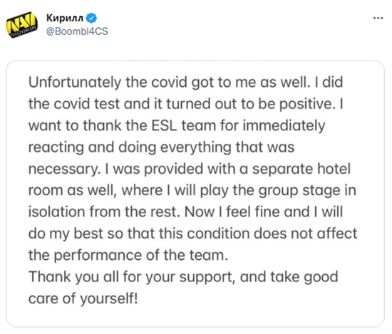 NaVi队长Boombl4在社交媒体上发布了自己在IEM卡托维兹期间不幸染上新冠肺炎的消息。