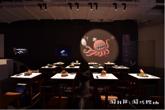 在有限的展厅空间里,休息区域也成为了展示的一部分。游客可以选一张单人餐桌落座,在他面前的将是一道《黑暗料理王》的还原菜品模型。
