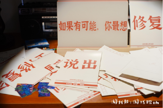 在完美的一天的展品的另一面墙边,有一张90年代风格的书桌。书桌上是“游托邦:游戏现场”少数可以带走的展品——一叠永远停留在1999年12月31日的日历贺卡,写有随机的一件愿望,接在“如果有可能,你最想__什么?”这一设问之中,观众可以从中抽走一张带走或留在桌上。照片中那张“修复”也被人带走,而被带走的这张卡片也将会定义下一位参观者所看见的愿望,如此往复——即使跳出了游戏游戏变成了装置艺术,创作者和玩家的这场对话也仍在继续。