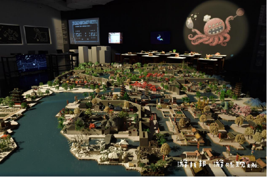 游托邦把游戏中最犀利最精炼的部分抽离了出来。在整个二楼展厅中,最吸引眼球的是一块巨大的微缩模型沙盘。苏州,杭州,徽州,应天府和松江府五大州府的水陆地形以及东园、柳浪闻莺、长庆塔寺、鱼梁水坝等景观建筑都齐聚在这块九平米大的微缩模型沙盘之上。沙盘本身由西安的专业团队历时近一年打造,而这一年之外,还有《江南百景图》制作团队的凝结心血的艺术创作。而作为这一创作过程的代表,原画成为了画帘,悬挂在展厅内的亭廊雕梁之上。
