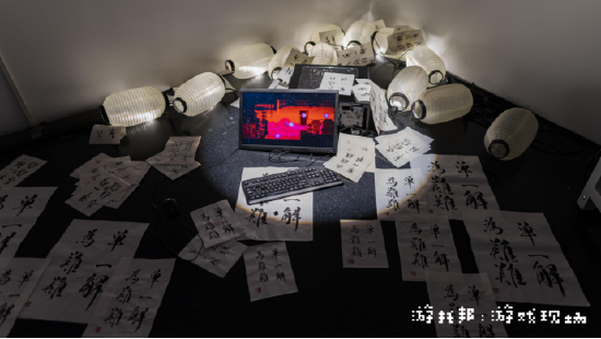 在《汐》的展位,写满了“单一解,为难难”的宣纸书法作品和“汐”堆成一团,而一个电脑显示器被这些写在宣纸上的宣泄包围在中间——正如一次次闯关一次次失败后的崩溃,观众进入开发者的环境并与其进行跨越时空的“竞赛”。