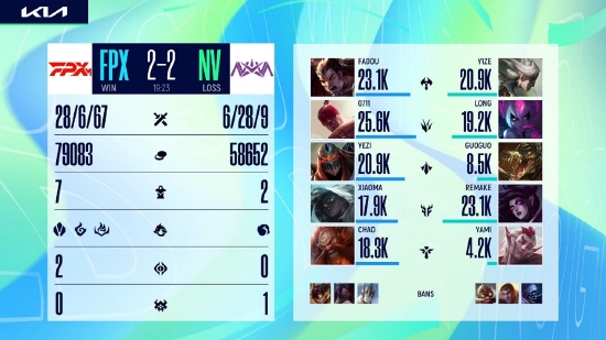 总决赛开局NV战队即展现出了强大的气势。前期NV战队打野Long的盲僧频频来到线上寻找机会,中期更是一波高光操作隔墙踢中三人,帮助队伍先下一城。压力面前FPX战队沉着应对,第二局依靠中路yezi杰斯超强的poke能力,打出完美团战击溃NV战队,将比分拉至1比1平。第三局中,NV战队前期线上优势显著,尽管中期FPX战队射手Xiaoma收获三连破,最终不敌NV战队阵容强大的后期团战能力,惜败对局。而下一局里,FPX战队6分钟即取得了4000的经济领先,虽然NV战队打野Long的寡妇表现亮眼,但最终难敌大势所趋,双方再次追平比分。