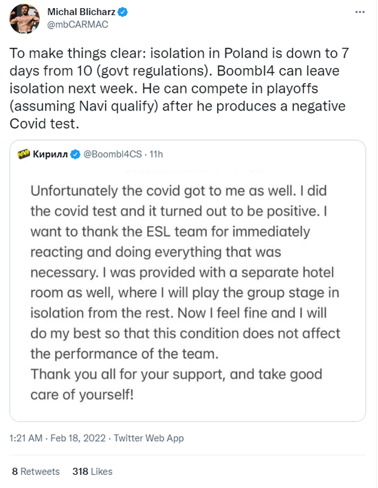 “明确一下:波兰当前的隔离期已经从10天减少至7天(根据政策),所以Boombl4可能在下周走出隔离状态。”